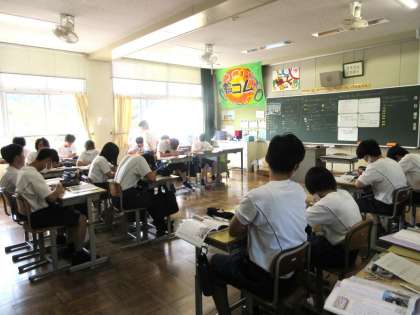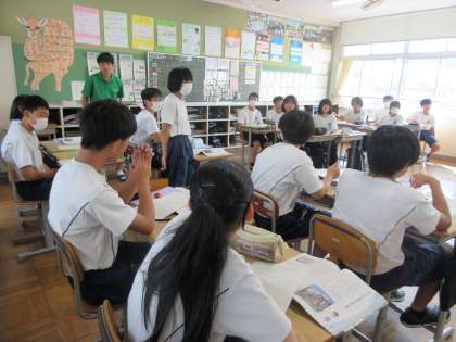 「小さな工場の大きな仕事」を教材に、社会に貢献することについて考えています。職場体験学習で見聞きしたこと、感じたことをからめながら自分の意見を発表していました。