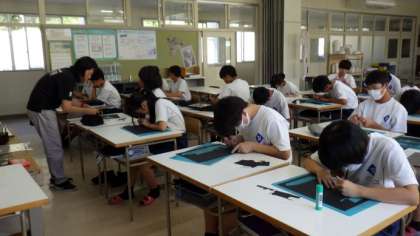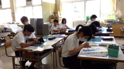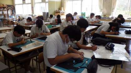 浮世絵をモチーフにした切り絵に取り組んでいます。線が細かいため、かなりの集中力が必要なようで、黙々と線を描いたり切ったりしていました。