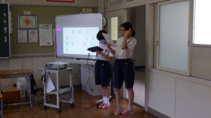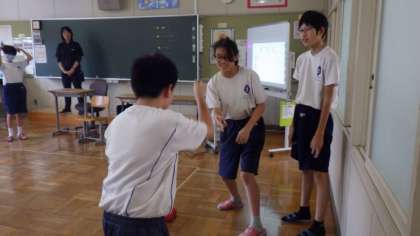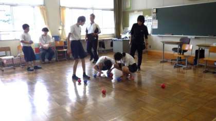 授業参観にみえた保護者の方と一緒にボッチャを楽しんでいます。ルールやコツを説明し、チームを組んで対戦しました。