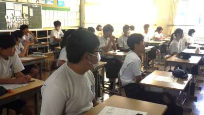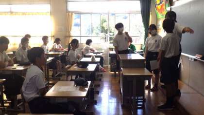 冬に実施する自然教室のスローガンについて話し合っています。一人一人から出された意見をいくつかの柱にまとめて話し合っていました。