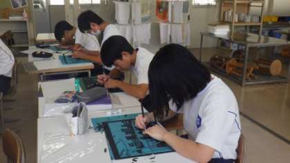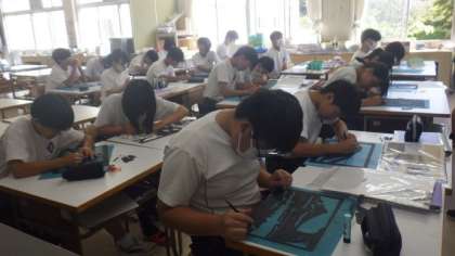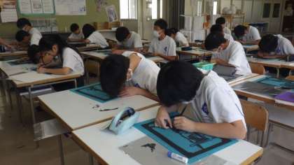 浮世絵をモチーフにした切り絵がだんだん完成に近づいています。細かな線が切れないよう、集中して手を動かしていました。
