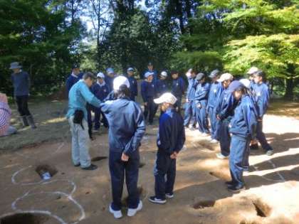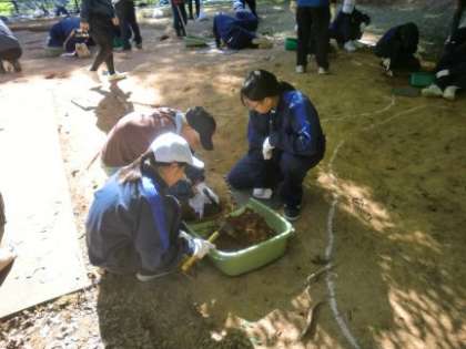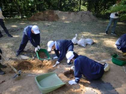晴天に恵まれ、市場城址発掘調査に1年生が参加しました。土器のかけらのようなものを見つけた生徒もいました。