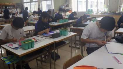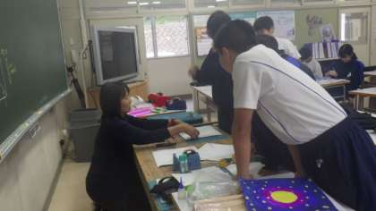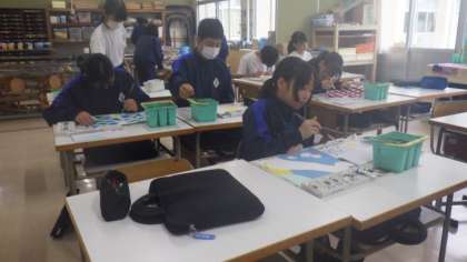 大きな風車を作っています。色を塗ったり、測って穴をあける位置を決めたり、どんどん制作を進めていました。