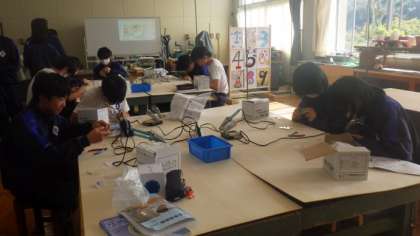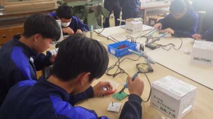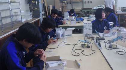 ラジオを組み立てています。半田ごてを使って、接着していました。