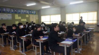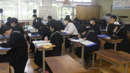 雅楽「越天楽」を鑑賞しています。特有の楽器の形や音色、奏法に気を付けながら聴いていました。