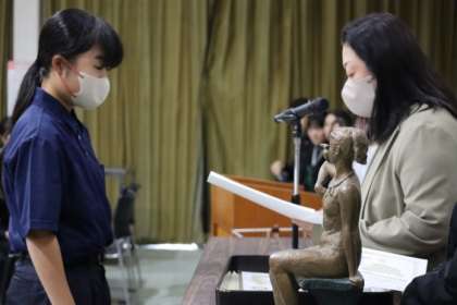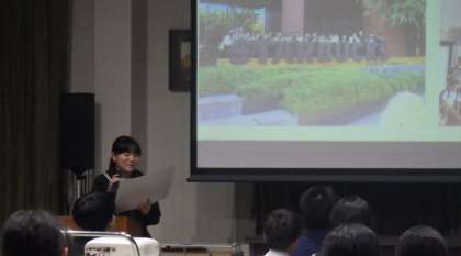 今回の全校集会では、表彰伝達と海外派遣体験発表を行いました。豊田市科学研究作品展の表彰伝達の後、アメリカ団とイギリス団それぞれに参加した生徒から、訪れた場所や研究テーマについての報告がありました。