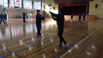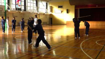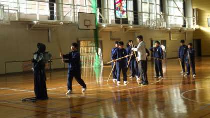 剣道の学習です。どんな姿勢で打つか、ペアになったり、先生に見てもらったりして、練習していました。