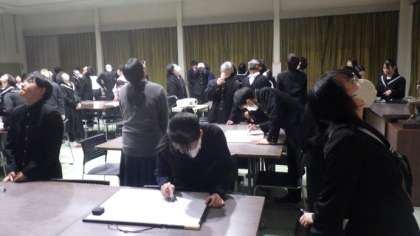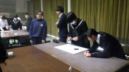 縦割り班に分かれて、生徒会が企画したレクリエーションを楽しんでいます。出されたお題を班の中で順にイラストで伝えるゲームです。正解できたときに歓声が上がっていました。