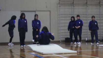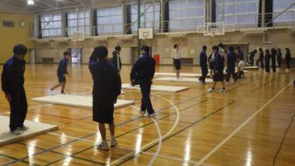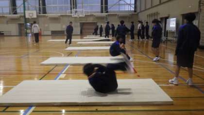 マット運動の学習です。補助マットを使ったり、互いに見合ったりして、後転や開脚後転の練習をしていました。
