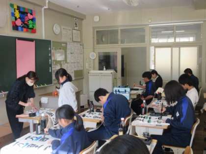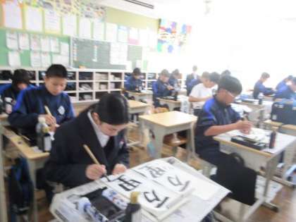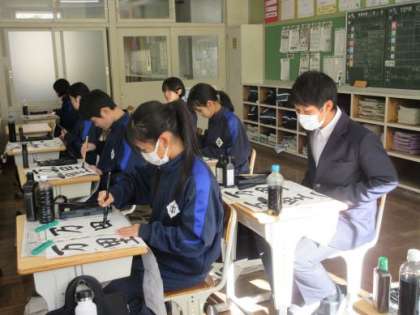 今年も豊田書道連盟から先生に来ていただき、書き初めの練習をしています。1年生が書く文字は「万里一空」です。