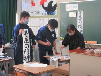 今年も豊田書道連盟から先生に来ていただき、書き初めの練習をしています。3年生が書く文字は「不屈の精神」です。