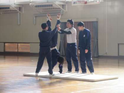 倒立の練習をグループで行っています。互いにアドバイスしたり、脚を支えたりしていました。