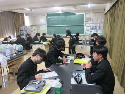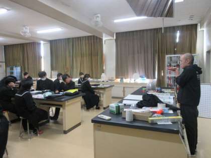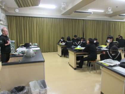 放射線について学習しています。用語の使い分けについての話を熱心に聞き、メモしていました。