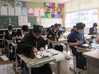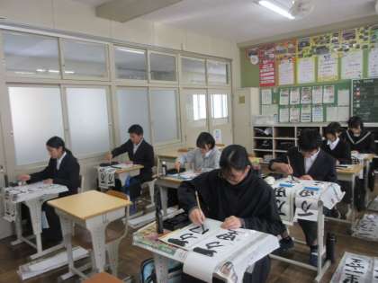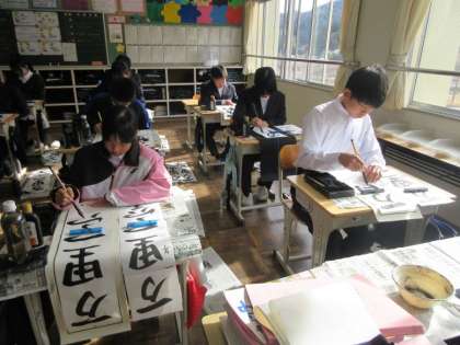 久しぶりの学校で、書き初めに取り組んでいます。冬休みにしっかりと練習し、いままでで一番よい字にしようと集中していました。