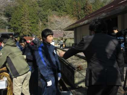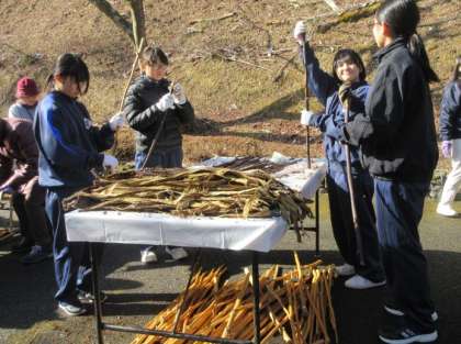 今年もカンゾカシキの季節が来ました。本校からは1年生が参加し、蒸した楮(こうぞ)の木の皮をむきました。手際よく作業し、あっという間にたくさんあった枝がむかれました。この冬の風物詩を取材しようと新聞社やテレビ局の方もみえて、生徒も取材を受けました。