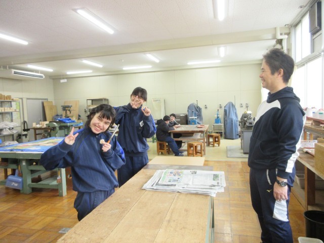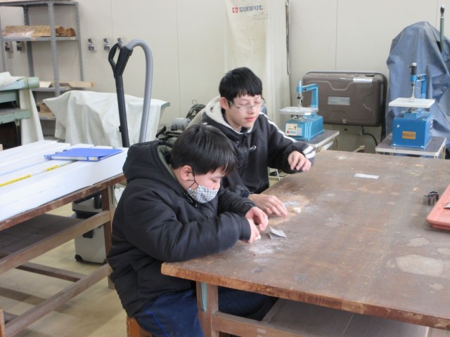 木製のキーホルダーを作っています。板を丸、星、ハートなどの形に糸鋸で切った後、やすりをかけてなめらかにしていました。