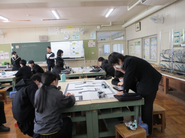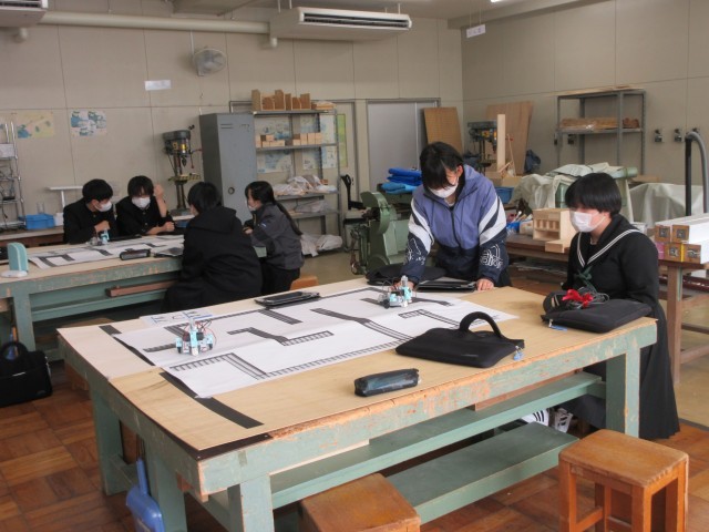 プログラミングで車を走らせています。迷路をうまく走ることができるか、調整しながら進めていました。