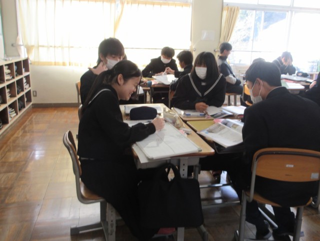 アラスカ州についての教材文を班でまとめています。ホワイトボードに班の意見を書いて、発表の準備をしていました。