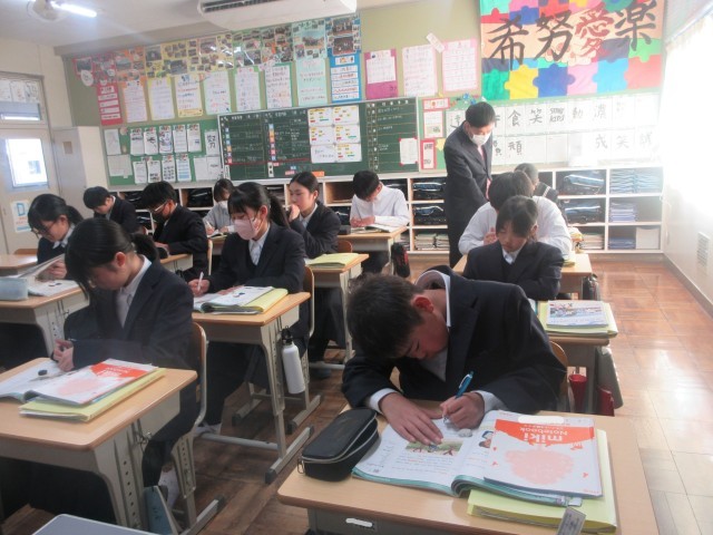 「昨日何をしましたか」のように過去の行動についての質問と答え方を学習しています。自分の家での過ごし方を文例を見ながら作文し、隣の人と会話していました。