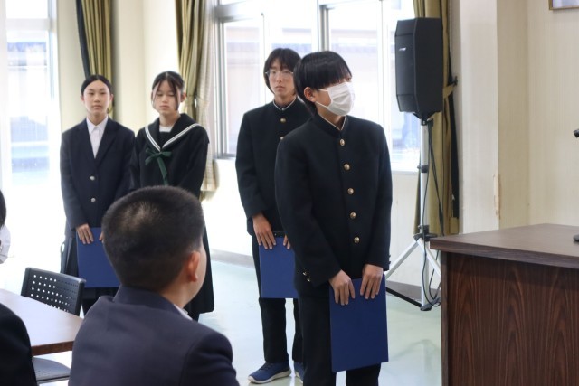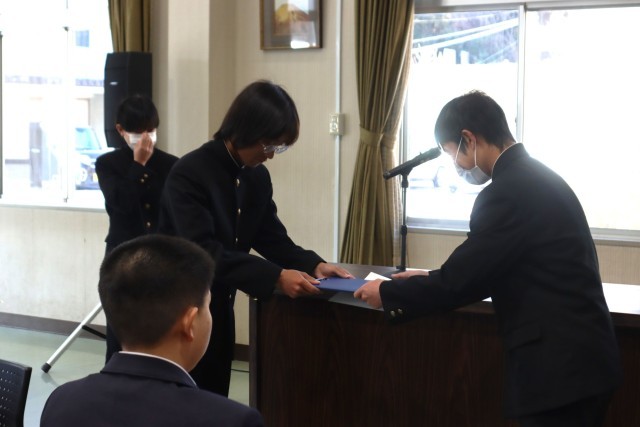 令和8年度前期生徒会役員が任命され、令和7年度後期役員から引継ぎが行われました。後期の会長から感謝と激励のあいさつ、前期の会長から抱負のあいさつがありました。
