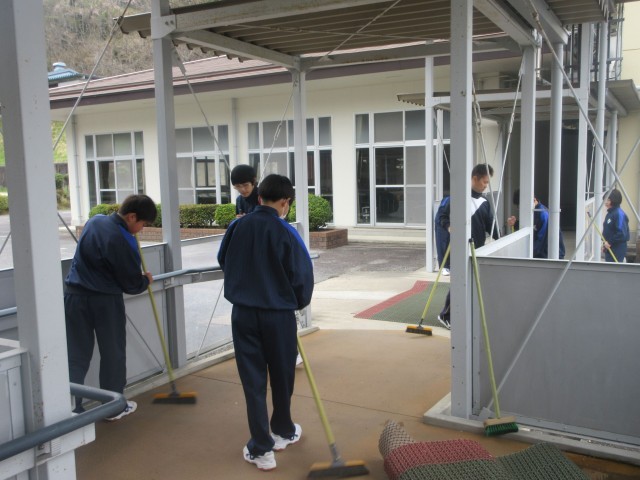新入生を迎えるために、新2、3年生が登校して、入学式準備を行いました。会場の体育館や1年生の教室などを清掃、飾りつけをしたり、教科書の仕分けをしたりしました。国歌や校歌で声出しも行い、準備が整いました。