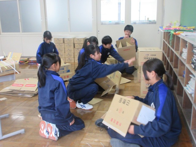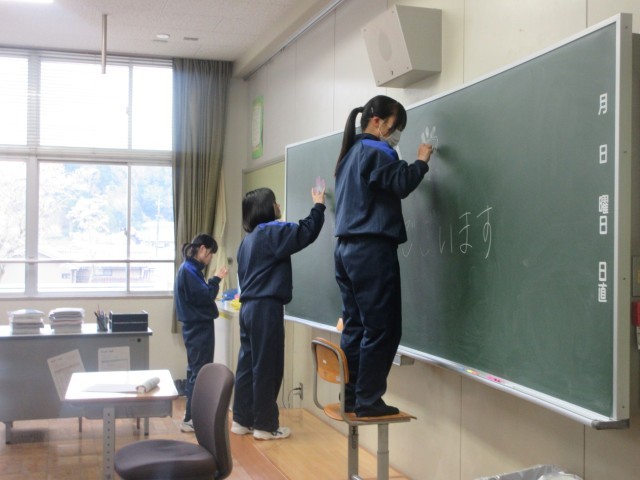新入生を迎えるために、新2、3年生が登校して、入学式準備を行いました。会場の体育館や1年生の教室などを清掃、飾りつけをしたり、教科書の仕分けをしたりしました。国歌や校歌で声出しも行い、準備が整いました。
