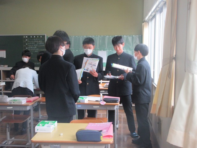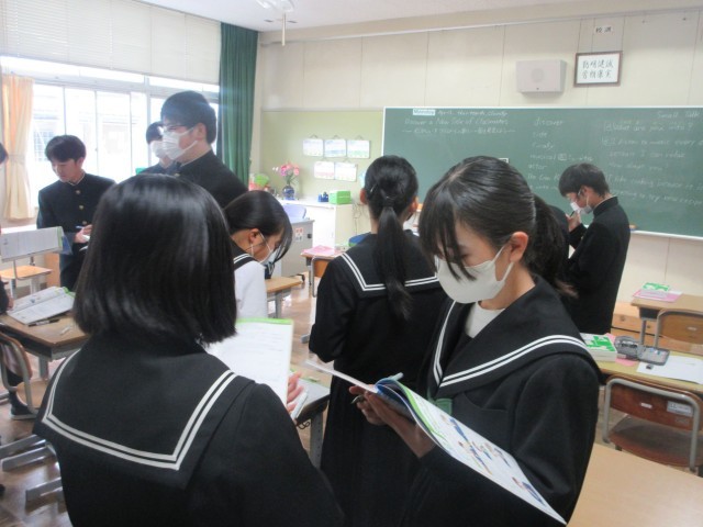 お互いに顔見知りのクラスメイトの新たな一面を知ろうと、英語で質問しています。