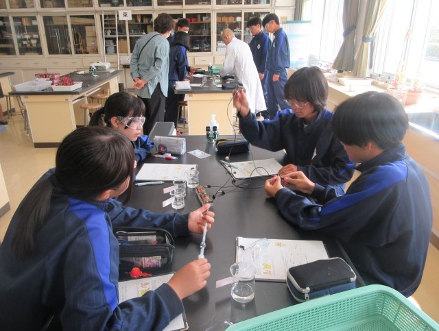 「どの水溶液が電気を通すか」実験しています。電気が通るとオルゴールの音が鳴る仕組みを使って、確かめていました。
