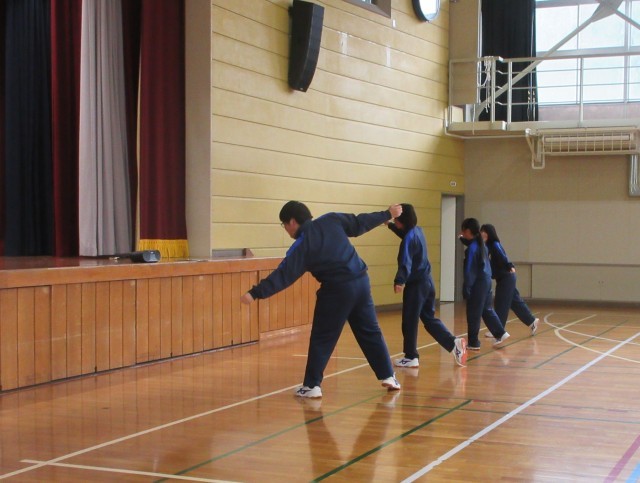 体育祭の「おば中ソーラン」を練習しています。3年生から1年生に教えるために、チームで細かな動きを確認していました。