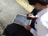3年美術の授業は、外に出て、スクラッチシートへのスケッチです。黒いシートに、針で...