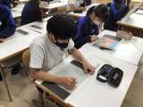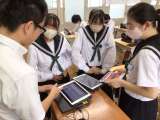 2年生は、タブレットを使って職場体験学習の成果をまとめています。