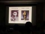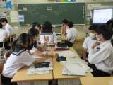 修学旅行の班別活動の報告をしています。写真などを効果的に使っていました。