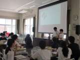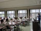 睡眠の大切さについて、保健委員の説明がありました。ニュースキャスター風の発表を全...