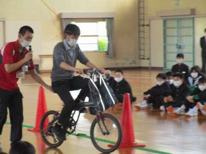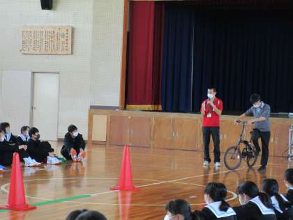 本校では、入学したばかりのこの時期に、1年生を対象にして、交通安全教室を開催しています。豊田市交通安全学習センターの所員2名にご来校いただき、交通ルールや令和2年4月より施行された豊田市自転車条例について学びを深めました。生徒の過半数が自転車通学者であるため、自転車運転中にどんなことを気をつけなければいけないか、どんな事故が過去にあったかなど、実際に自転車を使って指導いただきました。何よりも命が大切です。あとあと後悔しないためにも、交通安全には十分な注意をはらって登下校してくださいね。