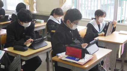 昨年度の12月に配置された1人一台のタブレットを用いて、本校では毎朝、健康観察を行っています。生徒たちは、朝の会の時間を使って入力しています。入学したての1年生もスムーズに入力を行っています。