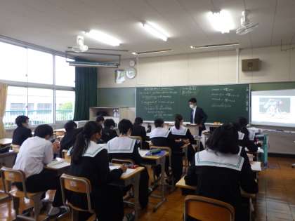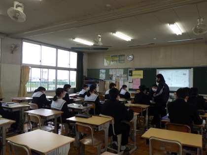 3年生の英語では、クラスを分けて2つの教室で少人数学習をしています。デジタル教科書をパソコンなどのICT機器を使用して大画面に映し、発音の確認をしています。Unit1では、パラリンピック競技について学びを深めています。今夏、東京オリンピック・パラリンピックが開催されるかどうか、生徒達も気になっているようでした。