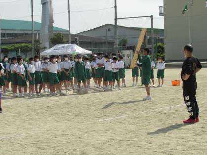 気温25度に迫る中、元気よく、また真剣に闘竜祭の練習や準備に取り組んでいます。グランドでは、団で集まっての練習なども行っており、3年生が、競技のコツなどを下級生にも説明していました。