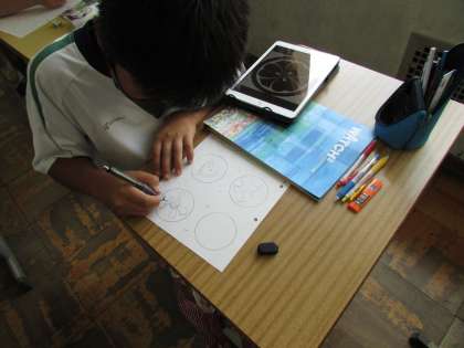 今年度は、ペーパーウェイトにチャレンジをしています。自然をテーマに各自モチーフを決めて、円形の形の中にデザインしていきます。作品はサンドブラスト加工で仕上げます。透明なガラス部分と砂が当たって白くなった部分のコントラストで図柄を表します。