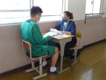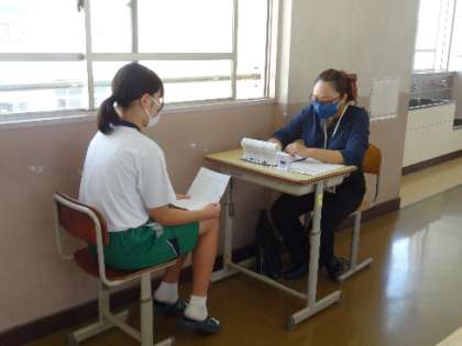 今週、3年生の英語の授業では、ALTの先生に部活や委員会の活動報告のスピーチを行いました。自分で考えた英文を緊張しながらも、1対1で発表できました。生徒は本番に向けて、発音の確認やスラスラ読む練習をしてきました。スピーチ後の先生からの質問に、苦戦しながら答えようとする姿も見られました。失敗や間違えを恐れずに、どんどん話すことが英語には大切です。ぜひ、ALTの先生に自分からいろいろなことを質問してみてください。