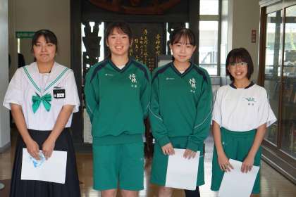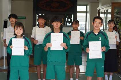 表彰式に続いて、後期生徒会役員の認証式も行われました。1枚目の写真は、後期生徒会役員のみなさんです。学校の大きな柱として活躍してくれることを期待しています。始業式の最後には後期の決意を各学年の代表生徒1名が語ってくれました。すばらしいお話の内容でした。4名のみなさん、ありがとうございました。