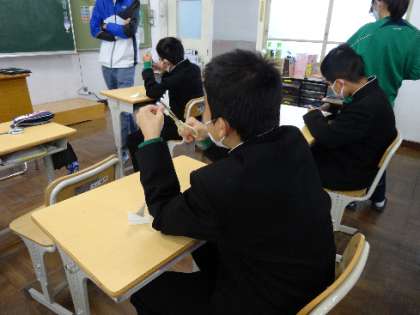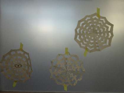 10月31日はハロウィンです。特別支援学級の英語では、一枚の紙で蜘蛛の巣を作りました。紙を何層にもおり、はさみで蜘蛛の巣になるように切りました。広げた時には、「すごい!」という声も聞こえてきました。切り終わった後は、床に落ちた切りくずを進んで拾う生徒もいました。季節の掲示物が増え、教室が華やかになりました。