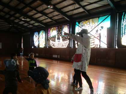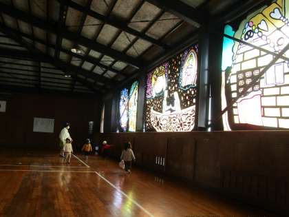 いつも竜神中学校のグラウンドを散歩道にしている竜神こども園のちびっ子たちが武道場に飾ってある美術部の作ったステンドグラスを見学していきました。「わー。きれい。」と大喜びでした。