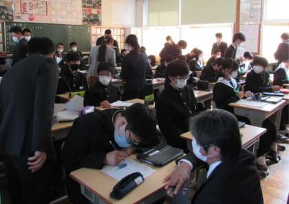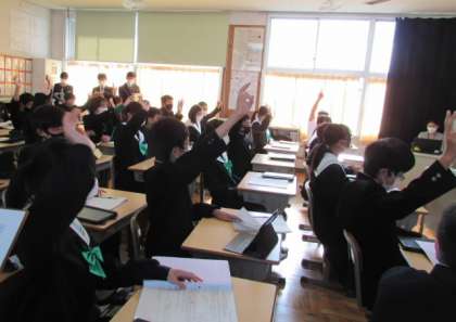 写真は1年2組の総合の授業の様子です。今月30日に行われるキャリアチャレンジデイに向けて、職業観や働くことの意義について話し合いました。自分の意見をしっかりもち、仲間の前で発表し合いました。1年2組のみなさんのすばらしい姿が見られました。