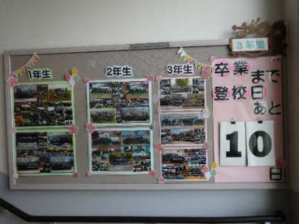 3年生の登校日も残り10日になりました。教室では、カウントダウンにあるみんなへのメッセージや、友達と楽しそうに話し笑い合う声が目立つようになりました。今週で最後の授業の教科もあり、先生方に最後の感謝を伝えることができたようです。先生方に手紙を書くなど、少しずつ卒業が近づいていると感じるようになりました。