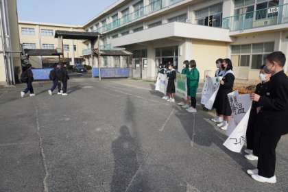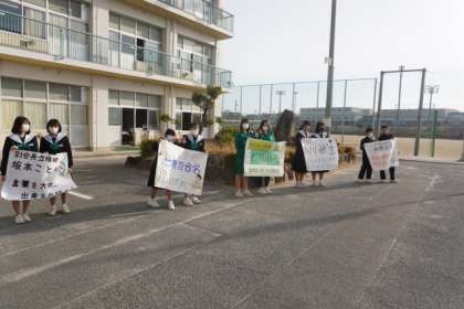 来年度の前期生徒会に立候補した生徒が選挙運動を行っています。他の生徒が登校してくる時間に責任者の生徒ともに元気よく挨拶をしています。また、朝の活動の時間には各クラスを周り、「こんな学校にしたい」という想いを伝えています。生徒会役員として頑張ってくれることを期待しています。