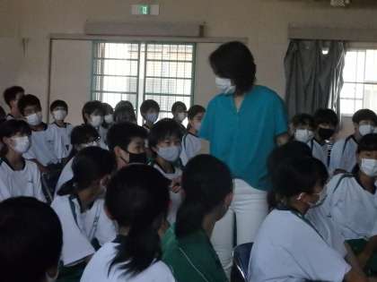 27日(金)5、6時間目。1年生を対象に「スマホ教室」が行われました。講師である逢楽先生の質問に最初は笑顔で答えていた生徒たちも、講演が進むにつれて次第に真剣な表情に変わっていきました。生徒にとって身近なスマホやSNS。そこにひそむ危険性や弊害について知り、使い方を改めて見直す機会となりました。