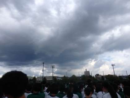 生徒の皆さんの上空に、小さく写るドローン、見えますか?