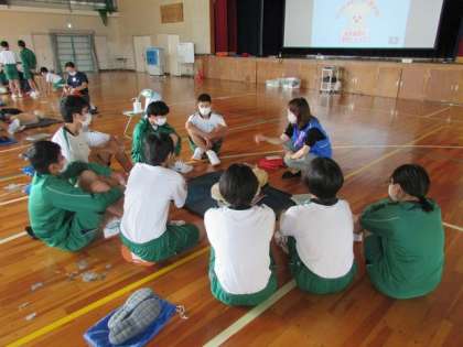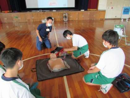 2年生は、午前中、消防署の方々から応急手当講習を受けました。心臓突然死が交通事故死よりもとても多いことや年間7万人の方が亡くなっていること、そのため、身近に起きるかもしれないこととして、いざという時のために胸骨圧迫(心臓マッサージ)の仕方やAEDの使い方について学びました。