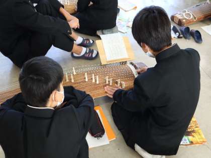 11月の後半から全学年の音楽の授業では箏(こと)を演奏しており、伝統的な日本の歌曲である「さくら さくら」の練習に励んでいます。生徒たちは曲の余韻を大切にしながら、一生懸命授業に取り組んでいます。箏の和を感じさせる音色にとても心が癒やされています。