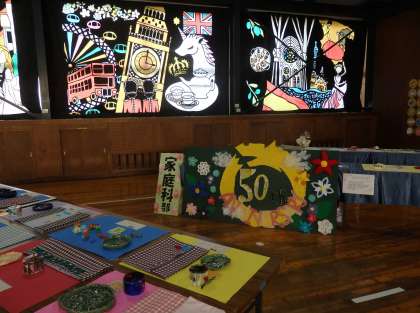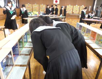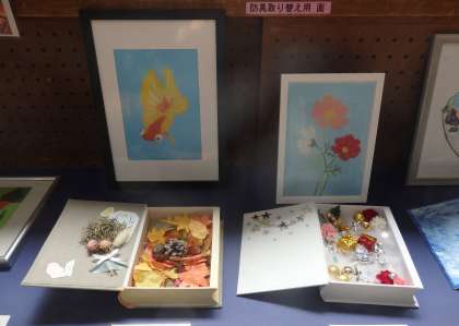 今週、武道場では、文化部、美術科の授業で制作した作品の展示会が行われています。最終日の今日は、1時間目からクラスごとに分かれて作品鑑賞会が行われました。自分の作品を探したり、友達の作品を興味津々に眺め感心したりする姿がありました。